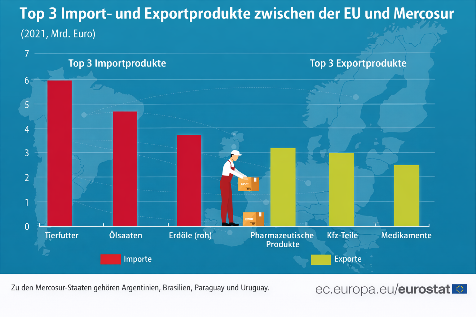 Diese Mercosur-Staaten handeln bereits intensiv mit Europa. Sie exportieren vor allem Agrarprodukte und Rohstoffe. Aus der EU importieren sie Maschinen, Fahrzeuge und pharmazeutische Produkte. Bisher war dieser Handel jedoch oft durch hohe Zölle, klare Handelshemmnisse und politische Unsicherheit geprägt.